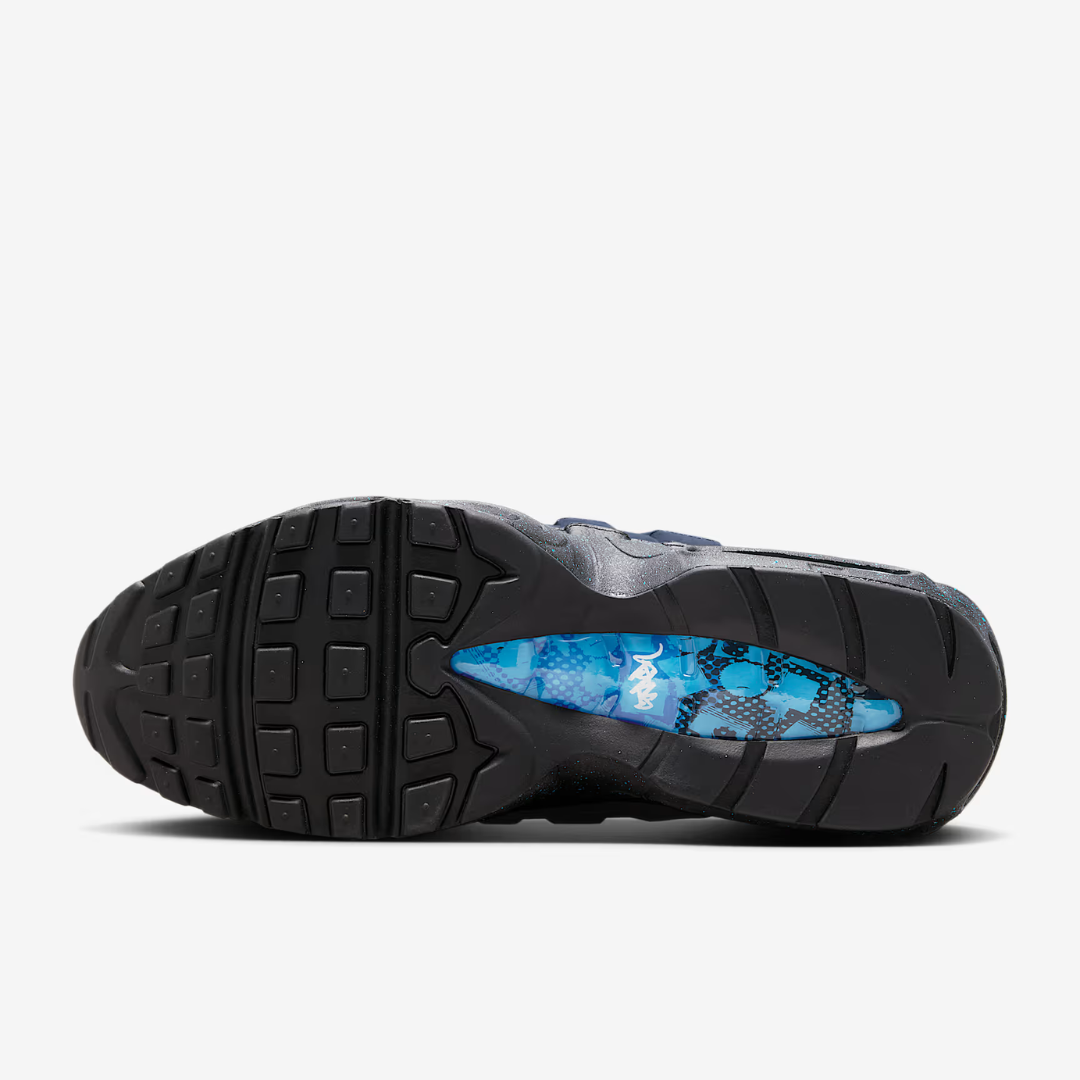 Air Max 95 x Stash Black and Harbor Blue spaja legendarnu siluetu sa umetničkim potpisom renomiranog umetnika Stash-a.Ova edicija dolazi u elegantnoj crnoj osnovi sa dubokim plavo-tirkiznim akcentima, stvarajući prepoznatljivu, a istovremeno svestranu kombinaciju boja.Vidljivi Air jastučići obezbeđuju vrhunsku amortizaciju i podršku za celodnevnu udobnost, dok premium materijali garantuju trajnost.Unikatni dizajnerski detalji ove kolaboracije naglašavaju vrhunski kvalitet izrade, zbog čega je ovaj model obavezna stvar u kolekciji svakog zaljubljenika u patike.